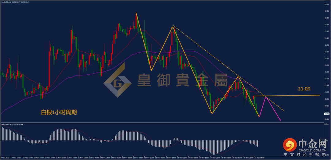白银走势比黄金弱,黄金调整进入第三天,白银今天已经是调整的第五天,也因调整时间较早,率先进入支撑位附近。从白银1H周期图看, MA21和MA60空头排序整齐完好,尽管有出现MACD背离现象,但日内未能突破MA21依然代表是空头趋势;结合4小时周期看,自高点22.30附近形成头肩顶的形态后,目前跌破颈线位持续下跌,MACD未出现底背离信号,代表空头未结束,建议日内高空为主。日内关注21.00附近压力位,此处为1小时布林中轨压力位,如果反弹至此压力位附近,建议轻仓布局空单。