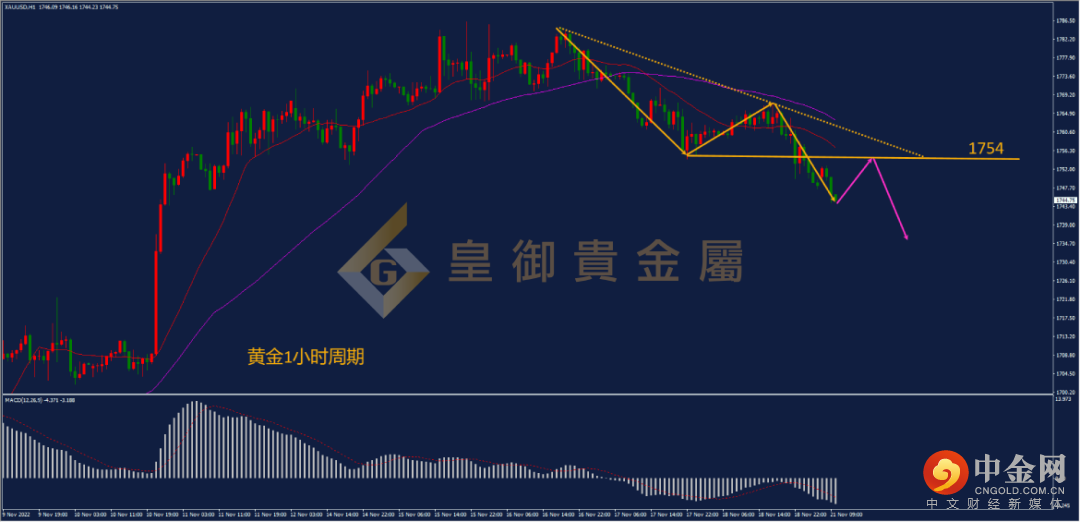 从黄金1H周期图来看,自1616.5附近上涨近169美金以来,上周开始出现两天调整,今天为调整的第三天,目前依然处于下跌的通道内,MA21和MA60同时也处于空头排序过程中,并且MACD未出现底背离信号,代表调整还未结束,日内操作建议空单布局为主,操作上关注上周五低点1754附近的压力位,同时又是1小时布林带中轨压力位,如果反弹至此压力位附近,建议轻仓布局空单。