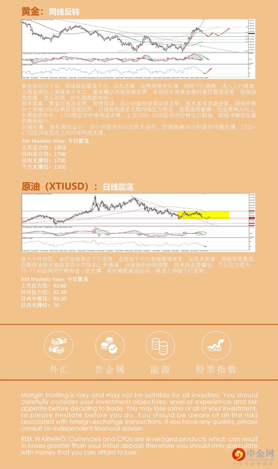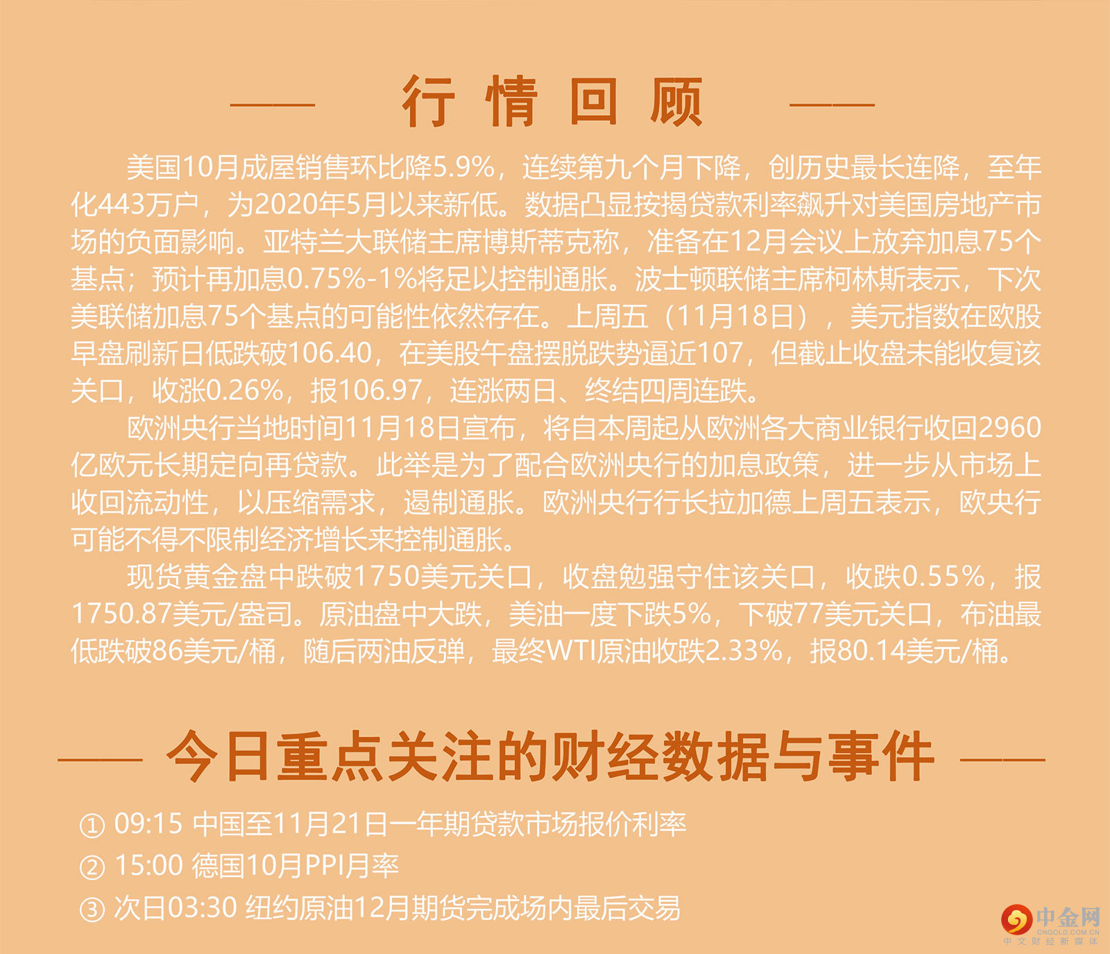 美国10月成屋销售环比降5.9%,连续第九个月下降,创历史最长连降,至年化443万户,为2020年5月以来新低。数据凸显按揭贷款利率飙升对美国房地产市场的负面影响。亚特兰大联储主席博斯蒂克称,准备在12月会议上放弃加息75个基点;预计再加息0.75%-1%将足以控制通胀。波士顿联储主席柯林斯表示,下次美联储加息75个基点的可能性依然存在。上周五(11月18日),美元指数在欧股早盘刷新日低跌破106.40,在美股午盘摆脱跌势逼近107,但截止收盘未能收复该关口,收涨0.26%,报106.97,连涨两日、终结四周连跌。 欧洲央行当地时间11月18日宣布,将自本周起从欧洲各大商业银行收回2960亿欧元长期定向再贷款。此举是为了配合欧洲央行的加息政策,进一步从市场上收回流动性,以压缩需求,遏制通胀。欧洲央行行长拉加德上周五表示,欧央行可能不得不限制经济增长来控制通胀。 现货黄金盘中跌破1750美元关口,收盘勉强守住该关口,收跌0.55%,报1750.87美元/盎司。原油盘中大跌,美油一度下跌5%,下破77美元关口,布油最低跌破86美元/桶,随后两油反弹,最终WTI原油收跌2.33%,报80.1