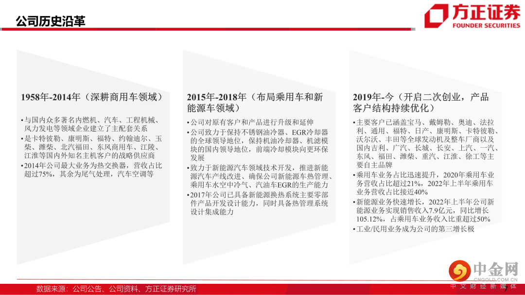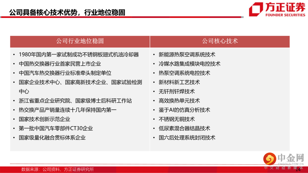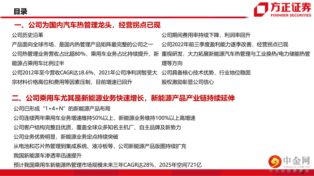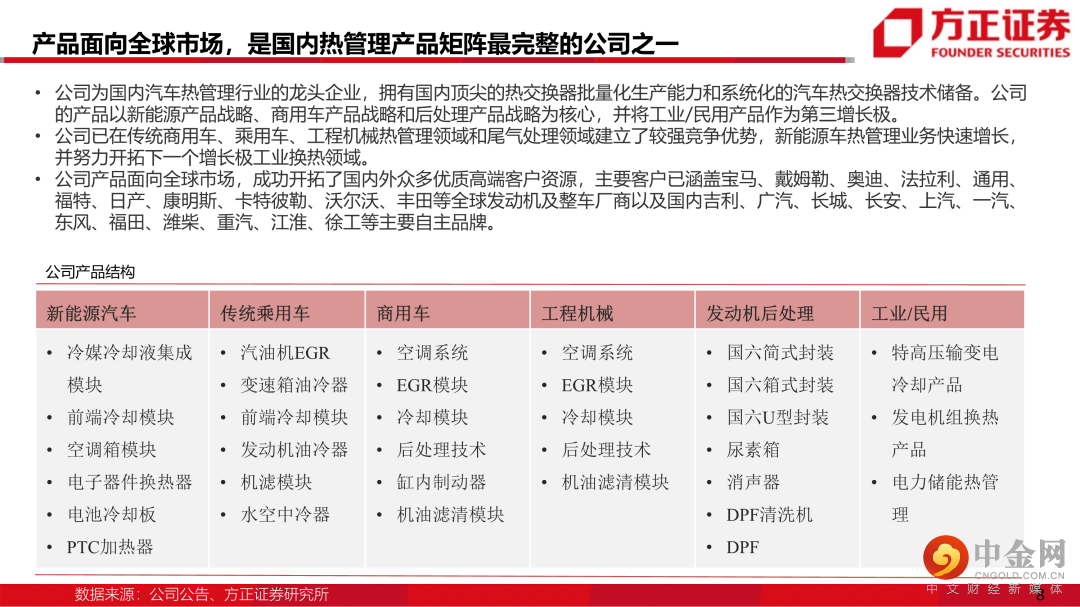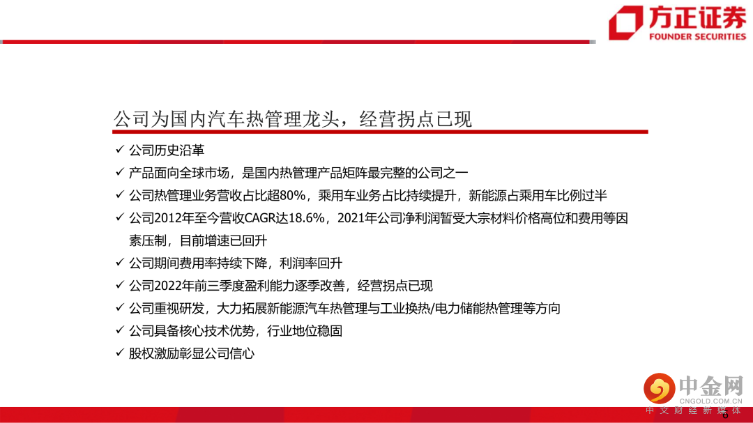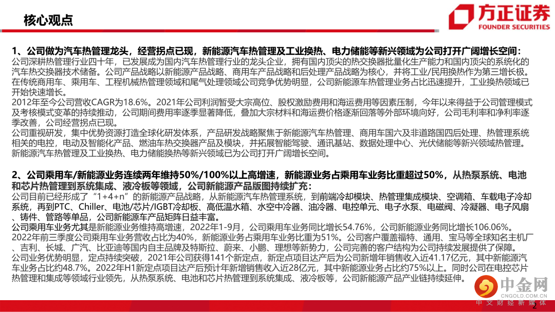 1、公司做为汽车热管理龙头,经营拐点已现,新能源汽车热管理及工业换热、电力储能等新兴领域为公司打开广阔增长空间:公司2012年至今公司营收CAGR为18.6%,今年以来得益于管理模式及考核模式变革的持续推动,公司期间费用率逐季显著降低,经营拐点已现。公司产品研发战略聚焦于新能源汽车热管理、商用车国六及非道路国四后处理、热管理系统相关的电控,电动及智能化产品、燃油车热交换器产品及模块,并拓展智能驾驶、通讯基站、数据处理中心、光伏储能等新兴领域热管理。新能源汽车热管理及工业换热、电力储能换热等新兴领域为公司打开广阔增长空间。