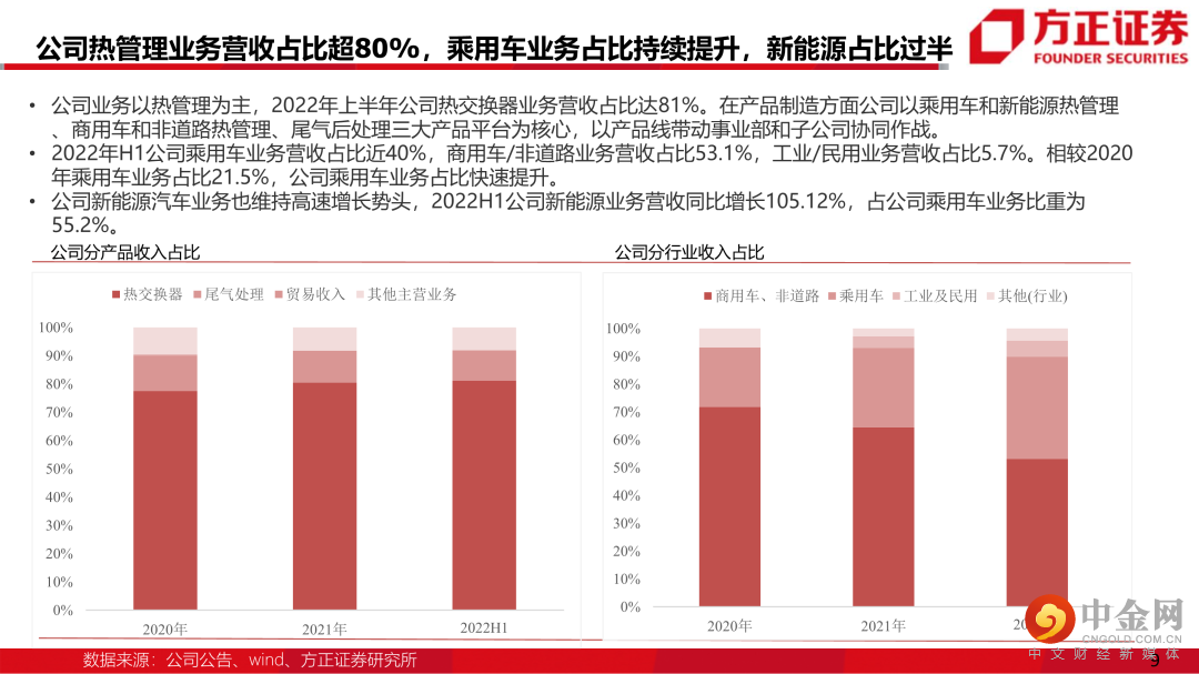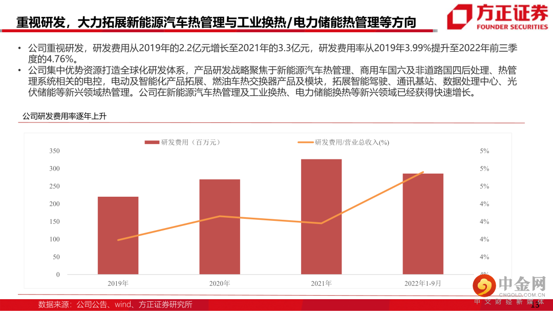 4、公司开启第三增长曲线,多点布局电力、储能等工业/民用热管理:2022年1-9月,公司工业/民用业务营收同比增长39.25%,营收占比从2020年的3.34%增长至5.7%。公司大力挖掘工业领域蓝海市场,培育战略性盈利增长点。