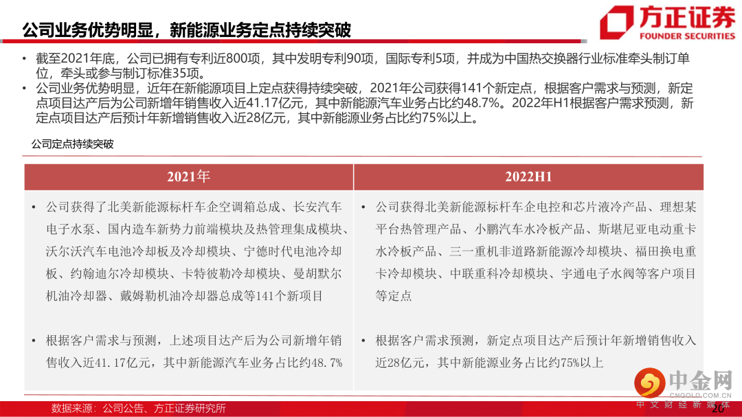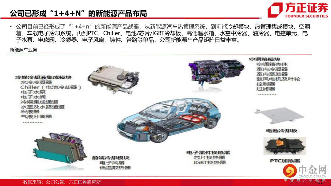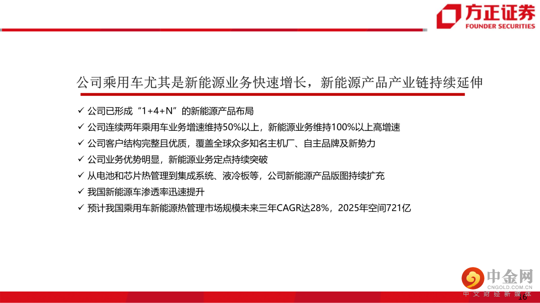 2、公司乘用车/新能源业务连续两年维持50%/100%以上高增速,新能源业务占乘用车业务比重超过50%,从热泵系统、电池和芯片热管理到系统集成、液冷板等领域,公司新能源产品版图持续扩充:公司已形成“1+4+n”的新能源产品战略,公司乘用车业务尤其是新能源业务维持高增速,客户覆盖福特、通用、宝马等全球知名主机厂、吉利、长城、广汽、比亚迪等国内自主品牌及特斯拉、蔚来、小鹏、理想等新势力。公司业务优势明显,定点持续突破,同时公司在电控芯片热管理和集成等领域行业领先,从热泵系统、电池和芯片热管理到系统集成、液冷板等,公司新能源产品产业链持续延伸。