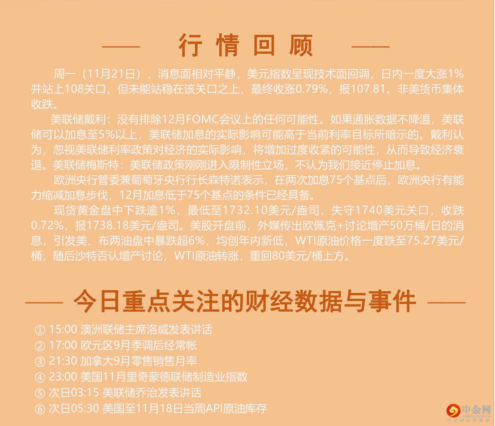 周一(11月21日),消息面相对平静,美元指数呈现技术面回调,日内一度大涨1%并站上108关口,但未能站稳在该关口之上,最终收涨0.79%,报107.81。非美货币集体收跌。 美联储戴利:没有排除12月FOMC会议上的任何可能性。如果通胀数据不降温,美联储可以加息至5%以上,美联储加息的实际影响可能高于当前利率目标所暗示的。戴利认为,忽视美联储利率政策对经济的实际影响,将增加过度收紧的可能性,从而导致经济衰退。美联储梅斯特:美联储政策刚刚进入限制性立场,不认为我们接近停止加息。 欧洲央行管委兼葡萄牙央行行长森特诺表示,在两次加息75个基点后,欧洲央行有能力缩减加息步伐,12月加息低于75个基点的条件已经具备。 现货黄金盘中下跌逾1%,最低至1732.10美元/盎司,失守1740美元关口,收跌0.72%,报1738.18美元/盎司。美股开盘前,外媒传出欧佩克+讨论增产50万桶/日的消息,引发美、布两油盘中暴跌超6%,均创年内新低,WTI原油价格一度跌至75.27美元/桶,随后沙特否认增产讨论,WTI原油转涨,重回80美元/桶上方。