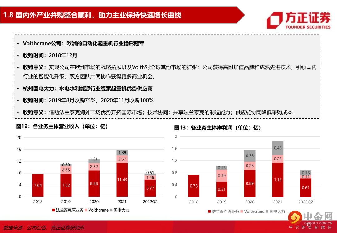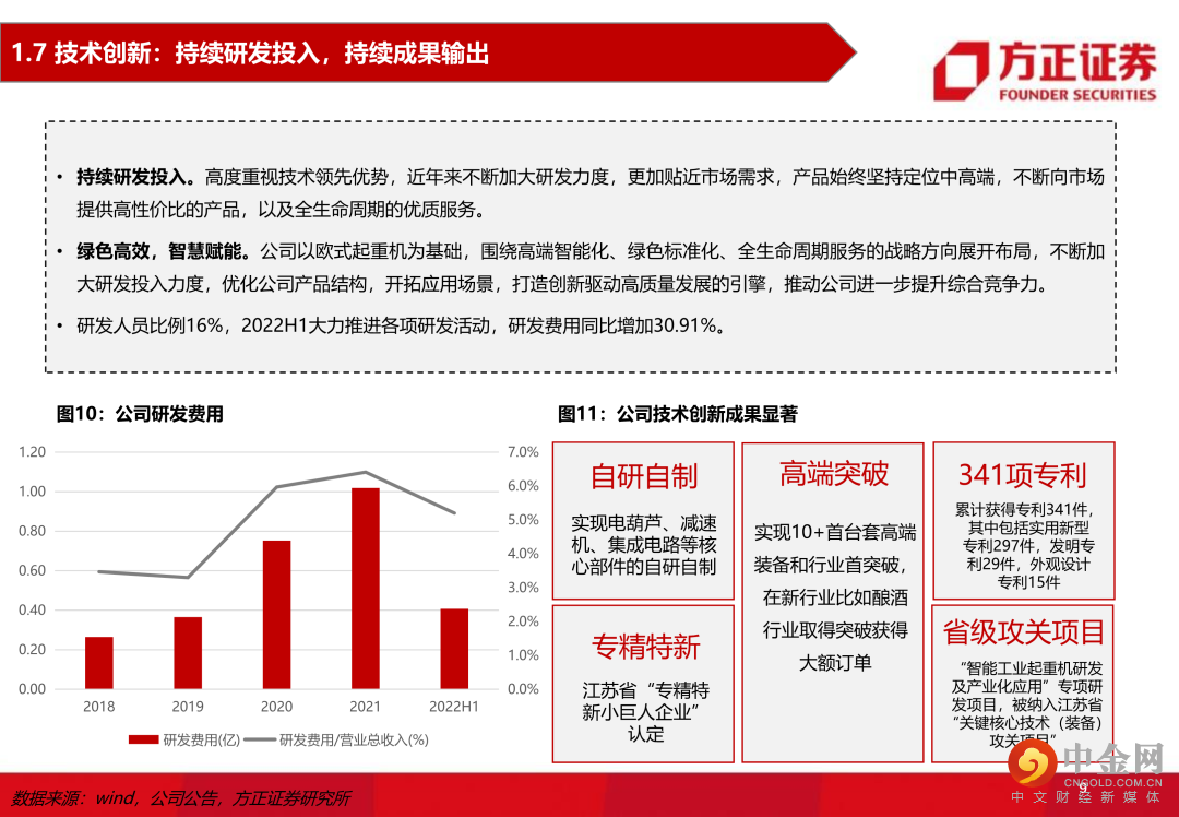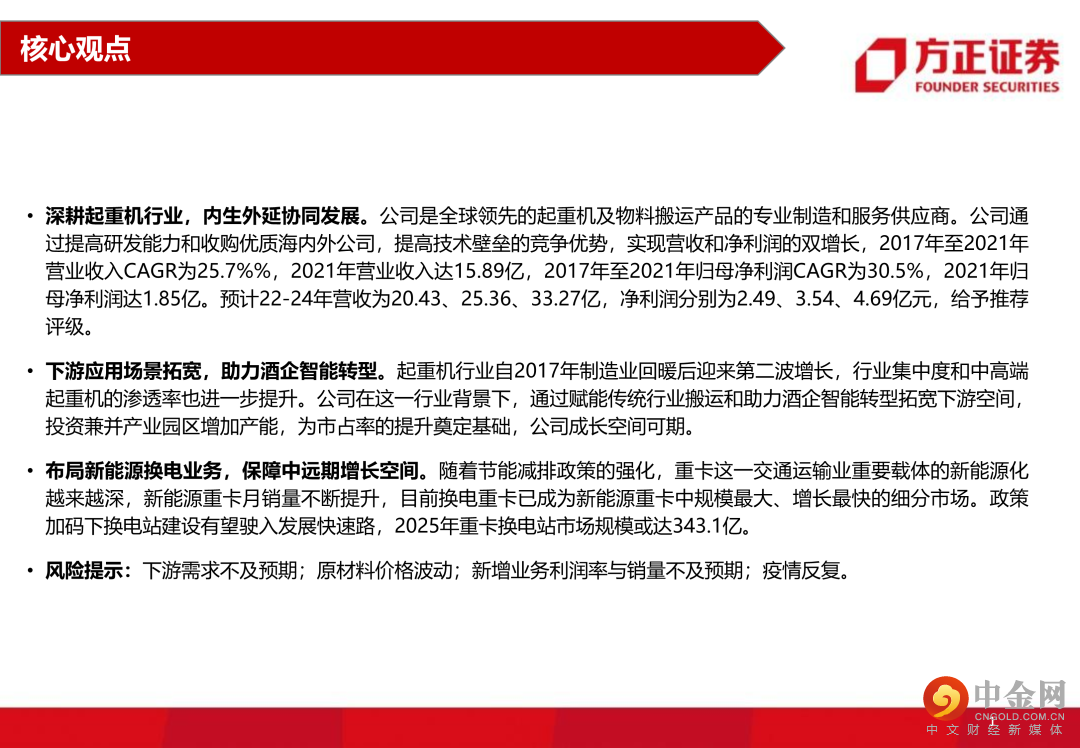 深耕起重机行业,内生外延协同发展。公司是全球领先的起重机及物料搬运产品的专业制造和服务供应商。公司通过提高研发能力和收购优质海内外公司,提高技术壁垒的竞争优势,实现营收和净利润的双增长,2017年至2021年营业收入CAGR为25.7%%,2021年营业收入达15.89亿,2017年至2021年归母净利润CAGR为30.5%,2021年归母净利润达1.85亿。预计22-24年营收为20.43、25.36、33.27亿,净利润分别为2.49、3.54、4.69亿元,给予推荐评级。
