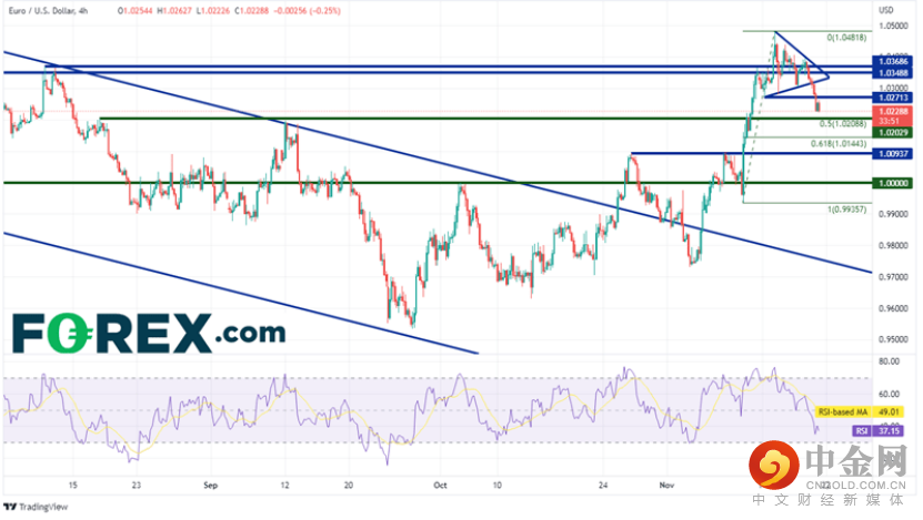 在240分钟图内,欧元/美元跌破了一个对称三角形形态。如果价格继续走低,则第一个支撑位在11月10日低点到11月15日高点的50%回档位,同时也是水平支撑位1.0203/1.0209附近。 在此下方,欧元/美元可能会跌至同时间级别内的61.8%斐波那契回档位1.0144附近,然后是水平支撑位1.0094。但如果支撑有效且欧元/美元出现反弹,那么第一个阻力位在三角形的低点1.0271。 如果价格在三角形内继续走高,汇合阻力位在8月10日高点和5月低点1.0349至1.0369之间。下一个阻力位是11月15日的高点1.0482。