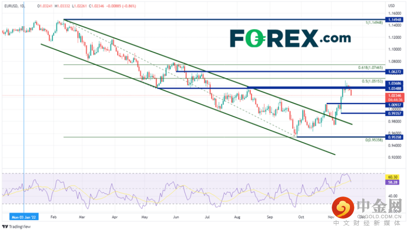 欧元/美元自今年年初价格达到1.1495的高点以来,一直处于下行通道。在9月28日,该货币对测试了该通道的下沿后开始反弹。这意味着着今年的低点为0.9532。 此后,欧元/美元一直走高,并于10月25日突破了该通道的上沿0.9925附近。 随后,该货币对震荡走高至1.0482,略低于2月10日高点至9月28日低点的50%回档位1.0515。