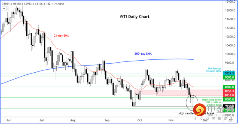 除非我们看到真正的迹象表明这确实是一个触底信号,否则无论你是看涨或做多,都要格外小心。近几个月来,随着价格不断走低,长期趋势转为看跌。其实在撰写本文时,WTI油价已经进入到一个很大的阻力区间,介于81.20美元左右至83.55美元之间。多头需要看到价格走出这一区域,并有效保持到收盘时。但如果没得到有效支撑,油价又跌回至今日开盘价下方,即跌破80美元,那么多头将会遇到困境。