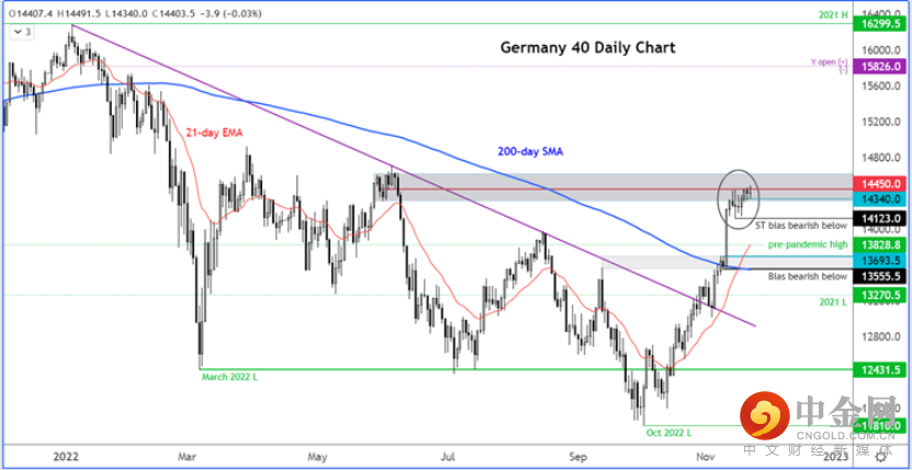 与此同时,空头躺平了。许多阻力位已被突破,降低了做空该市场的吸引力。他们至少要看到更低的短期低点,才会吸引他们中的一些人重新入场。因此,跌破近期低点14123将为可能跌至上述支撑区间13555至13695区域铺平道路。但如果随后跌破该区域,这将是一个显著的看跌走势。如果指数跌到那里,空头将有所行动。目前,空头几乎没有什么可做的。