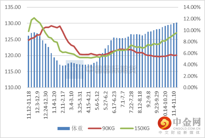 上周全国出栏平均体重130.19公斤,环比上涨0.11%,150公斤以上出栏占比9.53%,上涨0.32%;90公斤以下占比5.68%,上涨0.05%。猪价持续下行,养殖端心态出现变化,开始积极出栏大猪,但是终端走货不畅,大猪消化缓慢。随着气温降低,腌腊需求大猪增多,预计后期出栏均重逐渐增加。