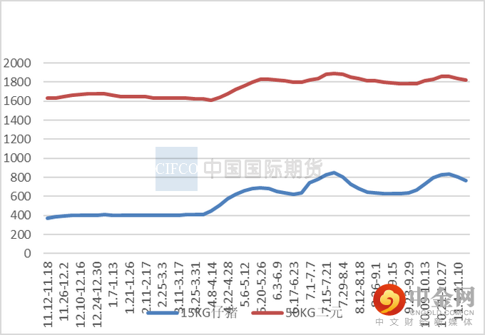 上周全国白条均价为31.02元/公斤,较下跌3.21%。上周白条价格随生猪价格下跌,随着降温影响,终端消费略有支撑,加之南方腌腊灌肠已经零星开始,出栏增加屠宰量小幅上涨。天气转凉后腌腊需求增加,预计后期白条有一定的上行空间。