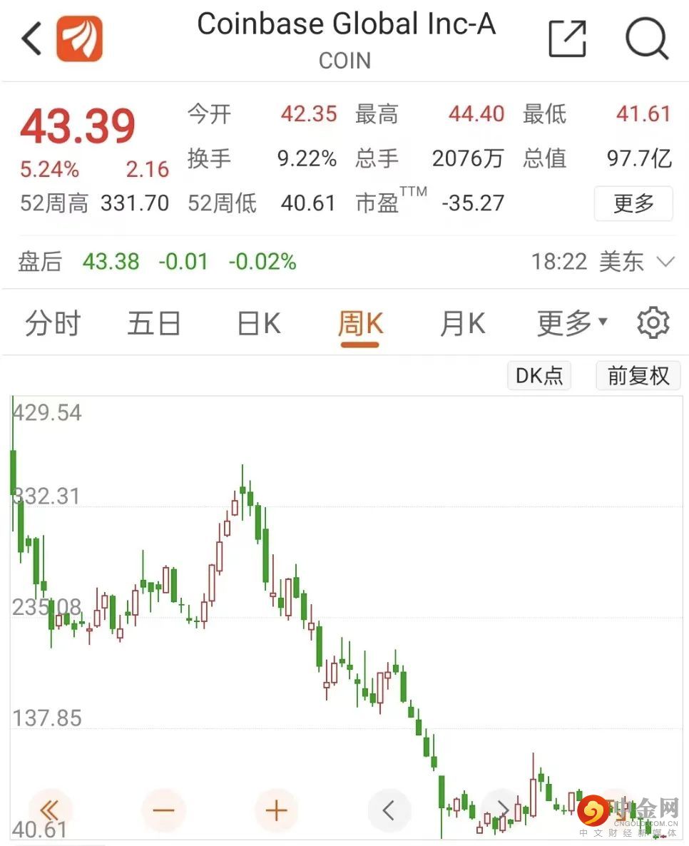 而Coinbase的股价却一路走低,最新股价已跌至43.39美元,总市值也已跌穿100亿美元大关,年内累计跌幅达82%,超出了主流的加密货币比特币、以太坊的年内跌幅。