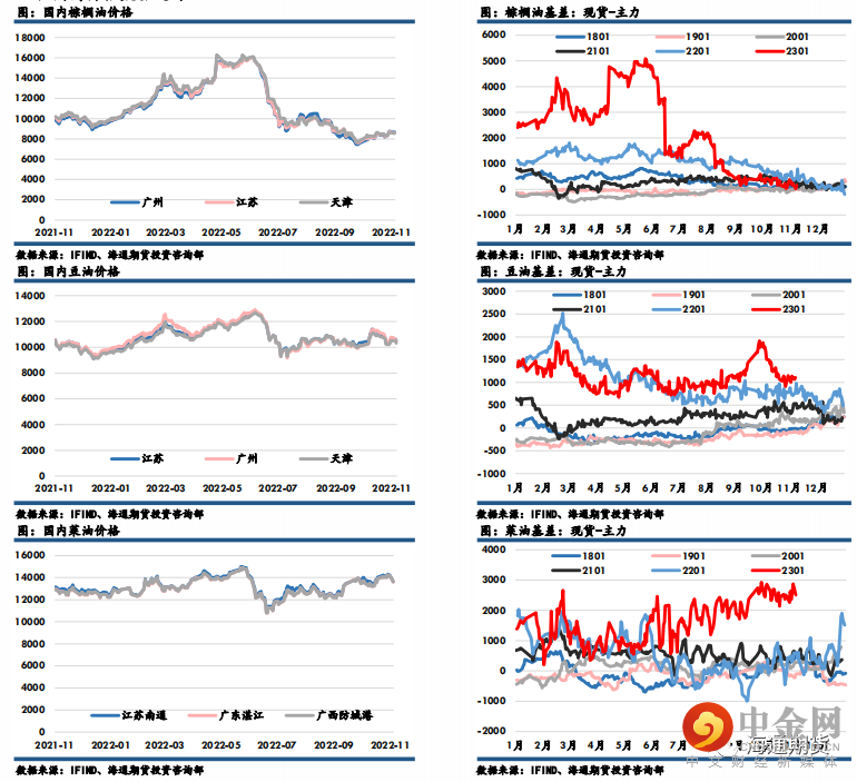 棕榈油主力收盘报7946元/吨,上涨106元/吨,涨幅1.35%;豆油主力收盘报9032元/吨,下跌48元,跌幅0.53%;菜油主力收盘报11142元/吨,下跌227元,跌幅2%。01月豆棕差至1086元/吨。美豆方面,当前巴西阿根廷大豆播种顺利,市场缺乏炒作消息,美豆进入震荡趋势。棕榈油方面,随着棕榈油生产步入淡季,后续产区供应压力将逐渐减轻。GAPKI公布的数据显示,9月印尼棕榈油产量为499万吨,出口为318万吨,9月末库存微降至40万吨,为正常库存水平。SPPOMA数据显示10月前20日马棕产量环比减少12.39%,持续关注高频产量数据。当前棕榈油相对其他植物油仍有较高性价比使得棕榈油需求仍有支撑,但随着主要需求国补库的完成,需求整体存在走弱的预期。船运机构数据显示马棕11月1-20日出口环+2.94%-+9.6%,出口增速收窄。国内方面,受疫情影响近期需求整体仍偏弱。棕榈油的陆续到港使得棕榈油供应改善最为明显,棕榈油库存增至历年同期高位,12月棕榈油采购偏少,关注棕榈油的采购和库存累积情况。随着后续大豆的陆续到港,豆油供应将逐渐改善,根据机构调研数据显示,本周油厂压榨量环比将明显增加至200万吨左右,关注大豆到港节奏和后期油脂需求情况,关注消费可能存在旺季不旺的风险。