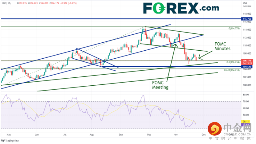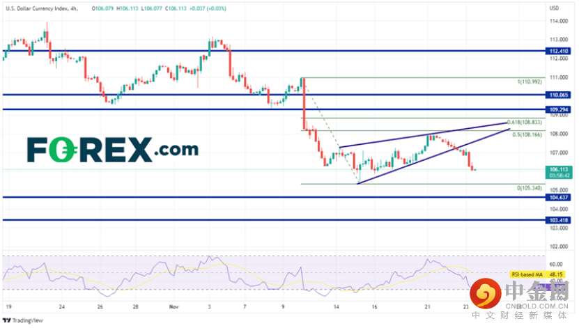 11月2日,美元指数最初的走势显示美联储将持鸽派立场。然而,在鲍威尔指出峰值利率会更高后,它随即走高。美元指数在11月2日收于111.55附近,基本持平,下影线较长。它在周五继续走高,达到高点113.15。然而,在市场有更多时间消化发言后,美元指数下跌220点,至110.72附近。然后,它突破了对称三角形的底部趋势线,此后该指数再也没有回头。美元指数在3月31日低点至9月28日高点区间的50%回撤位106.34附近止住跌势。今天,在FOMC会议纪要发布后,美元指数跌至106.03。