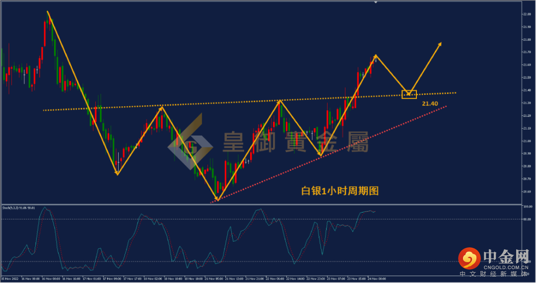 从下方白银1小时周期图看,白银于低位形成头肩底的技术形态,昨天一举突破颈线压力位,直逼前期高点。短线来看,白银多头趋势得到确定,后期回调低点支撑位后得到支撑并反弹的概率依旧较大。目前白银Stoch技术指标已经于80上方形成死叉,短线回调概率较大,投资者可以关注本次头肩底突破后的颈线支撑位,预计回调至此位置得到支撑并反弹的概率较大。建议尝试在21.40附近布局多单。