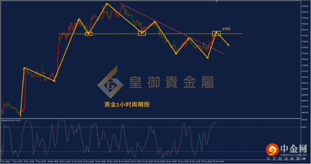 从黄金1小时周期图来看,昨日突破前期下跌趋势线,向上展开反弹,最高反弹至前期头肩顶的颈线压力位1755附近。从形态来看,黄金近期调整走势已经结束,短线有望展开新一轮上涨。但目前黄金涨幅较大,继续追高则风险较大,且黄金Stoch技术指标已经于80上方形成死叉,短线回调概率较大。投资者可以关注前期颈线压力位,预计此位置有望迎来小幅回调,建议尝试在此位置布局空单。