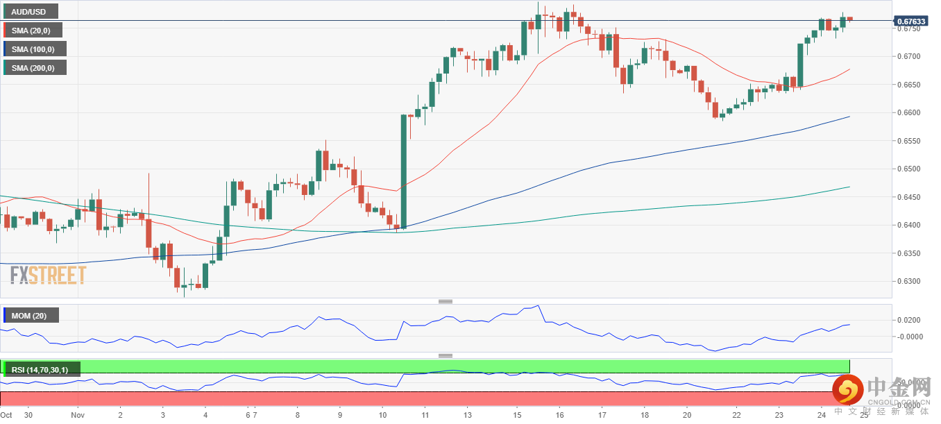 亚洲开盘前,澳元/美元交易于 0.6760 附近,连续第三天上涨。由于美国经济增长相关数据令人失望且美国联邦储备委员会会议纪要表现鸽派,导致美元下跌,而美元走软推动该货币对上涨。目前暂时缺乏新消息,在美国感恩节假期期间,欧洲时段中段交易活动减弱。