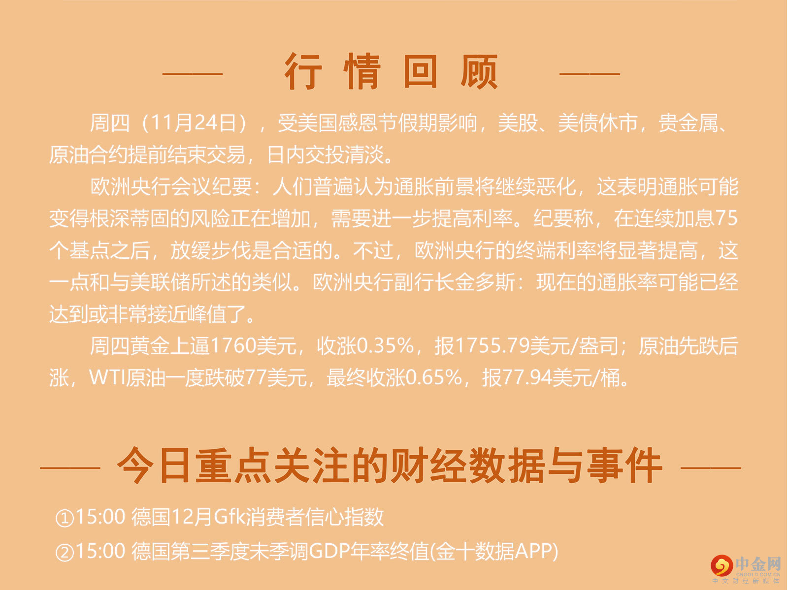 周四(11月24日),受美国感恩节假期影响,美股、美债休市,贵金属、原油合约提前结束交易,日内交投清淡。 欧洲央行会议纪要:人们普遍认为通胀前景将继续恶化,这表明通胀可能变得根深蒂固的风险正在增加,需要进一步提高利率。纪要称,在连续加息75个基点之后,放缓步伐是合适的。不过,欧洲央行的终端利率将显著提高,这一点和与美联储所述的类似。欧洲央行副行长金多斯:现在的通胀率可能已经达到或非常接近峰值了。 周四黄金上逼1760美元,收涨0.35%,报1755.79美元/盎司;原油先跌后涨,WTI原油一度跌破77美元,最终收涨0.65%,报77.94美元/桶。