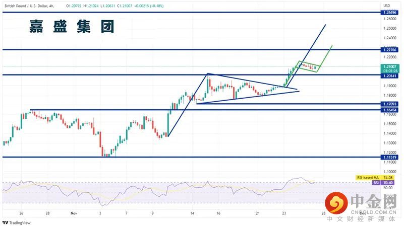 英镑/美元已远离9月26日触及的低点1.0357。最近,该货币对从1.1366走高并在1.1700/1.2000区域附近形成三角旗形。当价格接近三角旗形的顶点,英镑/美元突破后走高。三角旗形的目标点位为突破点加三角旗“杆”的高度。在本例中,目标位在1.2540附近。当然,价格很少沿直线移动,在到达目标位的过程中,该货币对在旗形的1.2100附近盘整。如果价格向上突破,该图形的目标位在1.2325附近。近期阻力位于短期旗形的高位1.2155附近。上方水平阻力位于8月10日高点1.2277。如果英镑/美元交投于三角旗形目标位上方,下一个阻力位在1.2670,这是5月27日以来的高点。然而,如果价格继续下修,第一个支撑位在11月15日高点1.2029。下方的支撑位在三角旗形低点1.1709,然后是10月26日以来的高点1.1645。