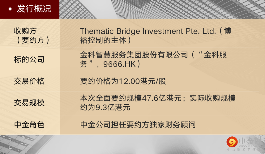 近日,中金公司协助博裕投资(“博裕”)以自愿性有条件全面现金要约方式增持金科智慧服务集团股份有限公司(“金科服务”,9666.HK)并成为第一大股东的交易已成功实施。