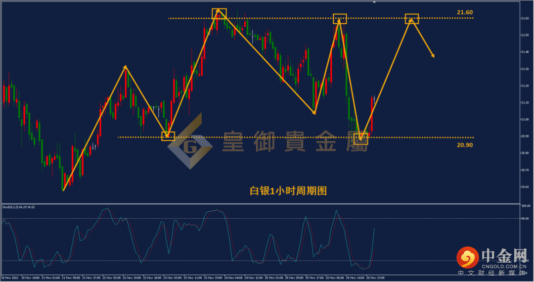 从下方白银1小时周期图看,白银围绕着20.90-21.60之间做区间震荡,当前震荡幅度较大,走势规律较为混乱。白银的操作难度相对较高,投资者应当多看少动,耐心等待高点压力位再行布局空单。当前白银Stoch技术指标刚于20下方形成金叉向上发散,短线白银多头动能还将继续释放。投资者可以耐心等待,待白银冲高至上方压力位21.60附近布局空单。