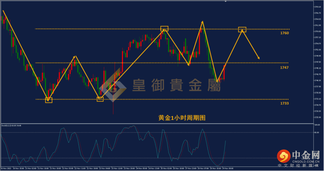 从黄金1小时周期图来看,黄金逐渐走入宽幅区间震荡的技术结构当中,震荡区间在1733-1747-1760之间。目前震荡结构还在延续,短时间黄金难有新的趋势形成。投资者不宜在震荡区间追涨杀跌,应保持足够耐心等待高低点进场。目前黄金回到中轨后继续向上反弹,短线Stoch技术指标还在向上发散,多头量能还在延续。后市如再度触碰区间上轨压力,预计高点回落的概率较大,建议投资者耐心等待1760附近布局空单。