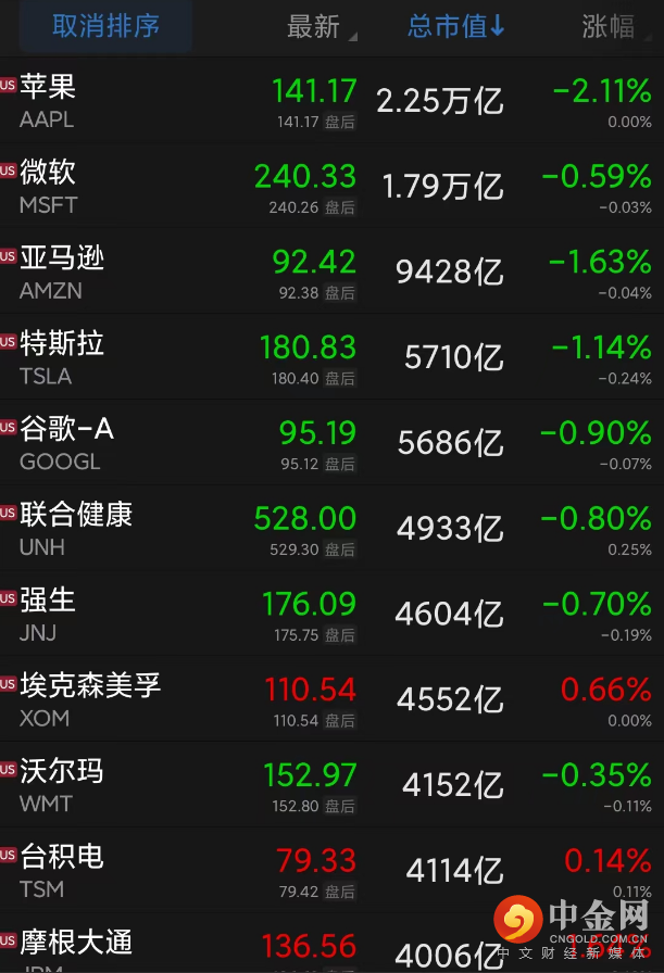 盘面上看,大型科技股多数下跌。苹果跌2.11%,亚马逊、特斯拉、英伟达跌超1%,谷歌-A跌0.9%,微软跌0.59%,脸书母公司Meta涨0.64%。