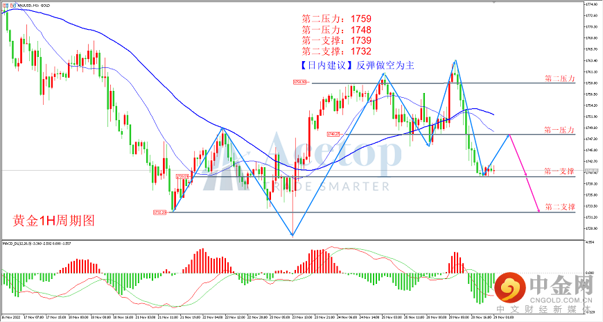 从黄金1H周期图来看,昨天上演倒V反转形态,多头趋势因欧洲鹰派言论影响,快速转为下跌趋势,MA21和MA60开始呈现空头排序;从MACD动能上看,动能柱昨天经历再次背离出现后,已经跌至0轴下方,并且目前没出现底背离信号,代表空头趋势开始占据上风;结合4小时周期,MACD动能柱进入0轴下方,MA21和MA60空头排序,代表日内偏空,建议高位为主,操作上关注1748阻力位,如果反弹至此阻力位附近,建议轻仓布局空单。
