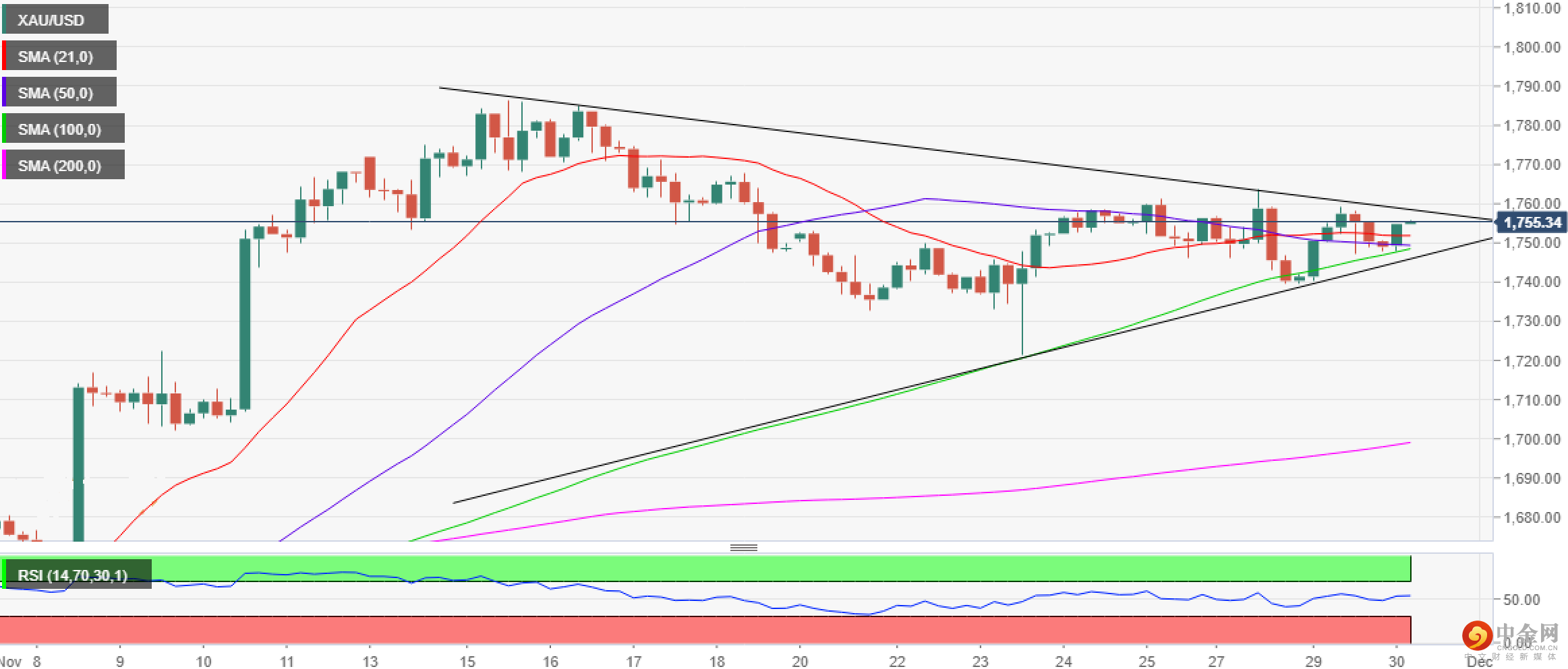 另一方面,强劲支撑位于 1750 美元附近,21、50 和 100 简单移动平均线 (SMA) 在此交汇。突破后者将暴露上升趋势线的支撑位 1745 美元。 持续跌破该支撑位可能会验证对称三角形的下行突破,为进一步下跌至 1730的整数位打开道路。
