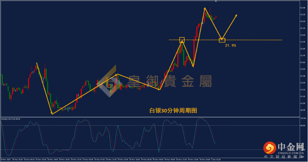 从下方白银30分钟周期图看,白银逐渐走出高低点同步上移的技术结构,昨日在消息面的影响下加速上攻。早间白银最高上攻至22.40附近,当前多头结构保持良好,短线回调低点支撑后反弹的概率依旧较大。目前Stoch指标正在向下发散,短线或有回调。投资者可以关注前期高点水平位21.95,此位置为前期压力,目前转为支撑,预计短线回落至此得到支撑并反弹的概率较大。建议尝试在此布局多单。