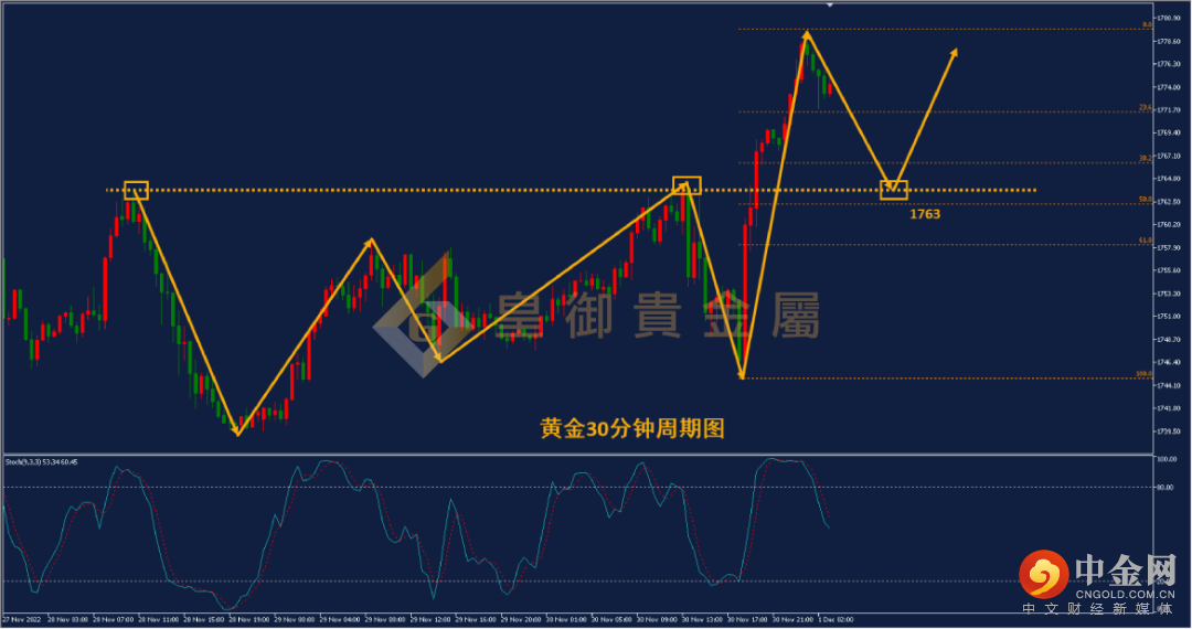 从黄金30分钟周期图来看,黄金昨天在消息面的带动下突破前期箱体整理结构,亚盘开盘后继续上拉,直逼1780的关口压力位。短线黄金突破前期整理区间后,多头趋势已然形成,后期回调低点布局多单符合当前趋势。目前黄金Stoch技术指标于高位形成死叉并向下发散,短线黄金或将迎来回调。回调可关注昨日上攻段黄金分割38.2%-50%之间的支撑位,此位置也是前期箱体整理的上沿压力位1763附近,现在压力变成支撑,回调至此后反弹上涨的概率依旧较大。建议投资者尝试在此位置布局多单。