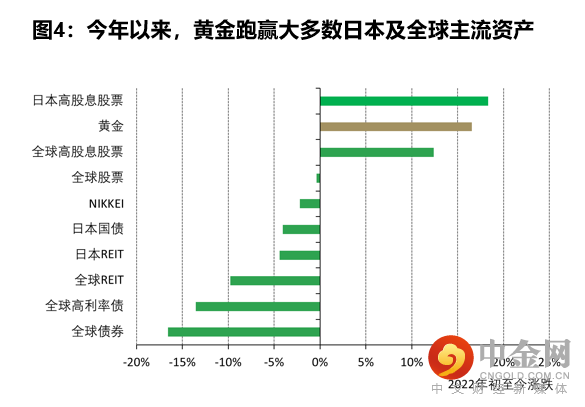 举例而言,日本日兴资产管理公司在旗下一支总规模超3600亿日元的基金中配置了17%的黄金。其配置黄金的主要原因是今年以来(截止10月底)日元对美元贬值了29%,而日元计价的黄金涨幅达17%。“黄金+”在组合中起到了抵御日元贬值的作用。
