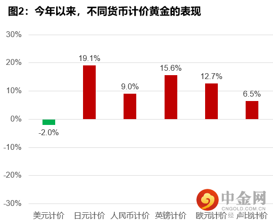 在全球主要风险资产和货币都出现大幅下跌的情况下,以各国当地货币计价的黄金成为少数表现稳健的资产。黄金抵御货币贬值风险的作用也体现于此。