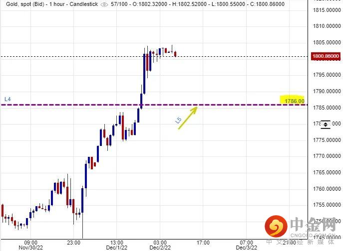 假若今晚稍后时间发布的美国11月份非农就业人数结果是低于预期平均预期20万的话,金价应该有力进一步向上测试$1,814美元附近的阻力。