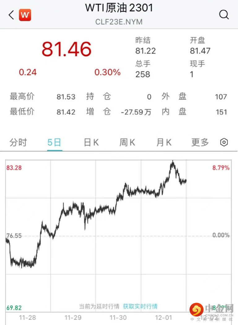截至收盘,WTI 1月原油期货收涨0.83%,报81.22美元/桶,目前位于81.45美元/桶附近;布伦特2月原油期货收涨0.14%,报86.88美元/桶,目前位于87.26%附近。