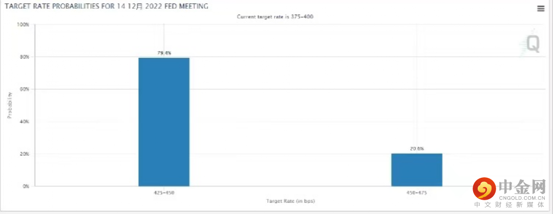 根据CME利率观测工具显示,目前美联储下次加息50个基点的概率为79%,加息75个基点的概率为20.6%。