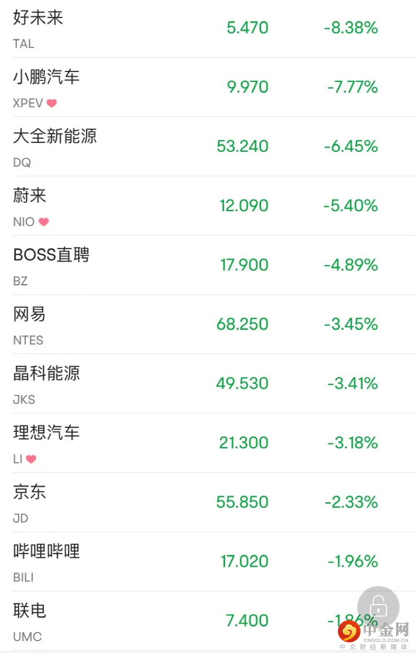 中概股结束连涨势头,新能源车回调明显,小鹏汽车跌近8%,蔚来跌超5%,理想汽车跌超3%。