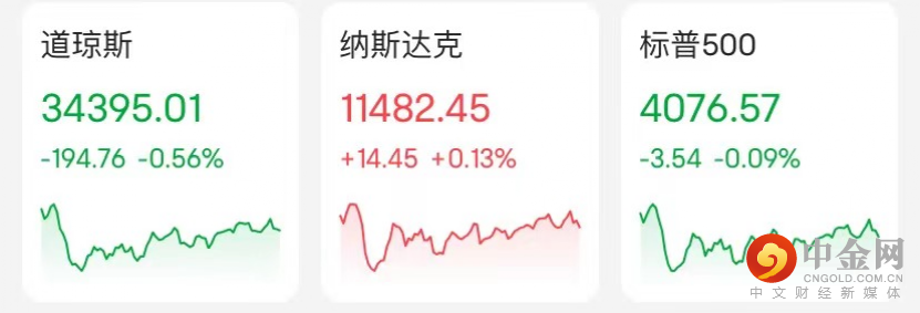 美股开盘道指下跌至超百点,后最深跌460点,尾盘时三大指数跌幅收窄,仅纳指勉强收涨。截至收盘,道琼斯指数跌0.56%,收跌194.76点,报34395.01点;标普500指数跌0.09%,报4076.57点;纳斯达克指数涨0.13%,报11482.45点。