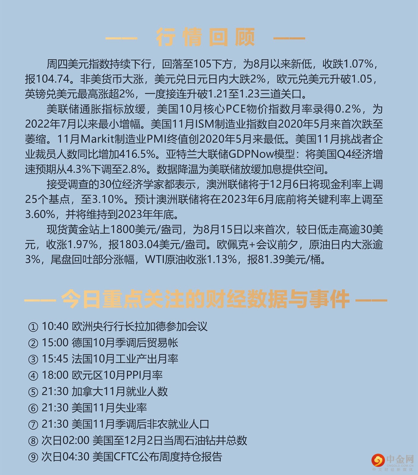 周四美元指数持续下行,回落至105下方,为8月以来新低,收跌1.07%,报104.74。非美货币大涨,美元兑日元日内大跌2%,欧元兑美元升破1.05,英镑兑美元最高涨超2%,一度接连升破1.21至1.23三道关口。 美联储通胀指标放缓,美国10月核心PCE物价指数月率录得0.2%,为2022年7月以来最小增幅。美国11月ISM制造业指数自2020年5月来首次跌至萎缩。11月Markit制造业PMI终值创2020年5月来最低。美国11月挑战者企业裁员人数同比增加416.5%。亚特兰大联储GDPNow模型:将美国Q4经济增速预期从4.3%下调至2.8%。数据降温为美联储放缓加息提供空间。 接受调查的30位经济学家都表示,澳洲联储将于12月6日将现金利率上调25个基点,至3.10%。预计澳洲联储将在2023年6月底前将关键利率上调至3.60%,并将维持到2023年年底。 现货黄金站上1800美元/盎司,为8月15日以来首次,较日低走高逾30美元,收涨1.97%,报1803.04美元/盎司。欧佩克+会议前夕,原油日内大涨逾3%,尾盘回吐部分涨幅,WTI原油收涨1.13%,报81.39美元/桶。