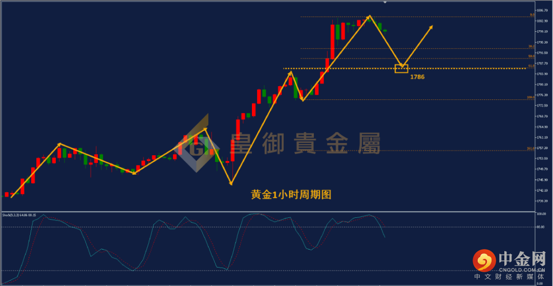 从黄金1小时周期图来看,黄金昨天再度突破前高,大涨30美金,最高上攻至1804附近,创本轮上涨以来的新高,也来到前期日线级别高点的水平压力位附近。短线来看,黄金多头趋势依旧保持良好,多头势头没有改变迹象,回调依旧建议布局多单。短线看黄金Stoch技术指标于80上形成死叉并向下发散,短线黄金将迎来回调,回调可以关注下方黄金分割61.8%的支撑位1786附近,此位置与昨日亚盘高点的水平支撑位较近,预计在此得到支撑并反弹的概率较大,建议尝试在此位置布局多单。