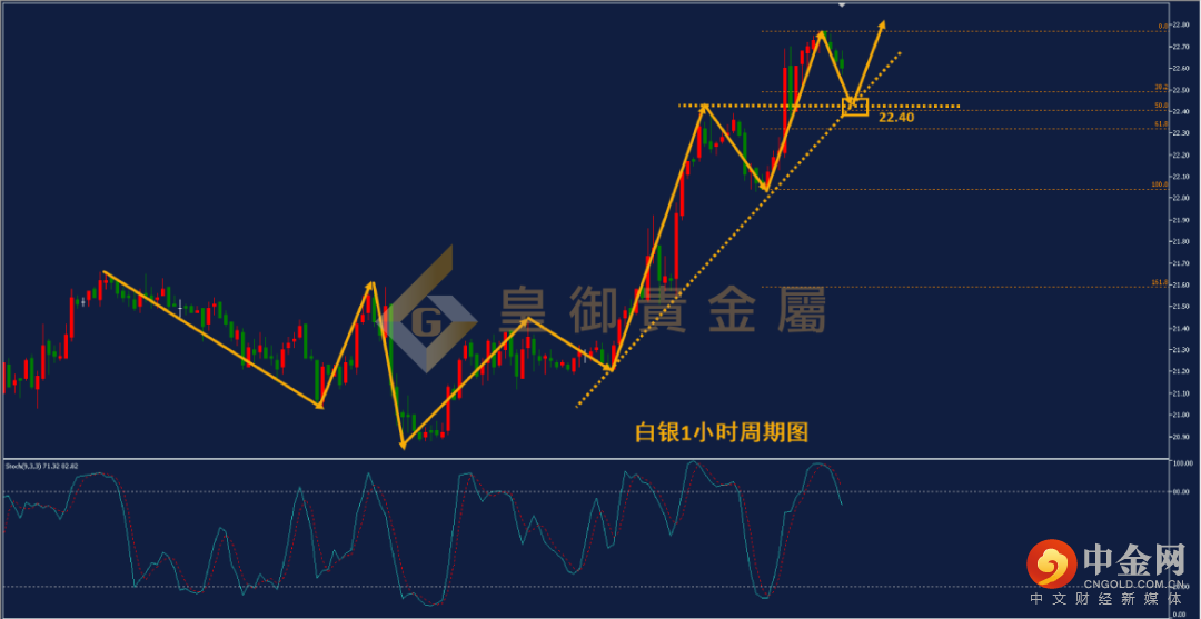 从下方白银1小时周期图看,白银走出高低点同步上移的技术结构,昨日再度突破前期高点水平压力位,最高上攻至22.77附近,创本轮上涨以来的新高。目前白银涨幅巨大,不建议继续追高,且短线Stoch技术指标形成死叉,调整概率较大。投资者可以关注下方上升趋势线与水平支撑位交汇的支撑位22.40附近,此位置同时也是黄金分割50%的支撑位,预计在此得到支撑并反弹的概率较大,建议尝试在此位置布局多单。