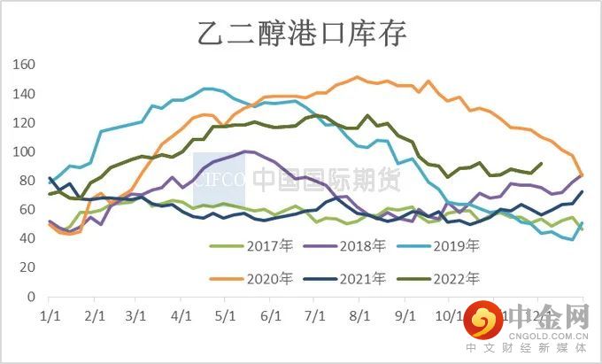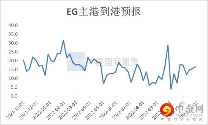11月港口库存逐步回升,月底华东主港地区MEG港口库存约92万吨,较10月底港口库存84万吨增加8万吨。11月乙二醇港口提货量较10月继续下降,由于下游聚酯开工下滑,聚酯工厂自港口提货意向下降,11月整体发货表现一般。11月末天气因素影响,码头仍有封航动作,库存持续堆积可能性较小。12月上旬乙二醇合约货抵港集中,预计顺利卸货后码头库存在12月中旬可回升至100万吨,库存高位仍有堆积空间。