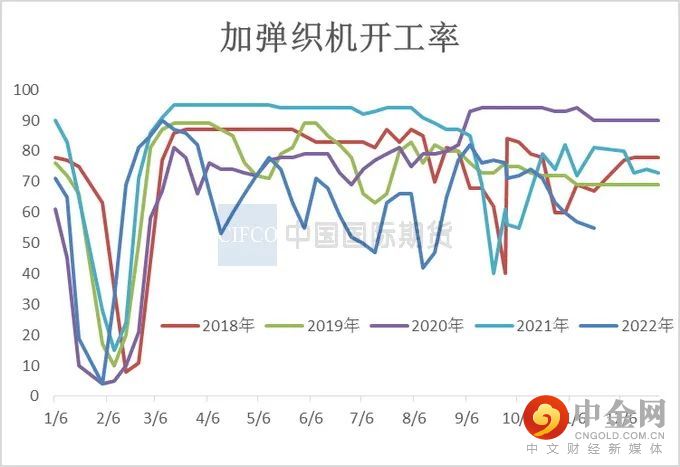 11月多地消费市场停滞,终端需求疲软以及聚酯开工下滑。终端提前放假,江浙加弹、织造11月月均开工下降至60%、50%附近。月末下游织造开机继续下降至46%,浙加弹江综合开工下降至55%。终端部分工厂在消耗原料后考虑停车,市场整体备货量持续下降。