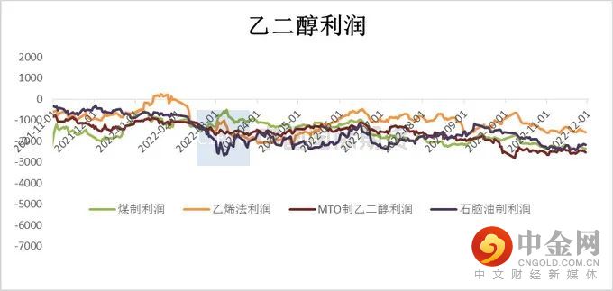 11月煤制乙二醇利润、石脑油制乙二醇利润持平于10月份水平。煤制乙二醇市场平均利润为-2295元/吨;甲醇制乙二醇市场毛利为-2508元/吨;乙烯制乙二醇平均利润为-1504元/吨;石脑油制乙二醇利润为-2299元/吨。11月煤炭价格明显回落,月内煤化工成本下移300-500元/吨不等。11月末内蒙古地区化工用煤价格环比11月上旬下跌200元/吨左右,燃料煤下跌50元/吨附近;而山西、安徽等地区企业化工煤及燃料煤实际到厂价格下跌幅度也在150-250元/吨不等,折合单吨乙二醇生产成本下降400-600元/吨。年初以来乙二醇利润呈现连续亏损状态。