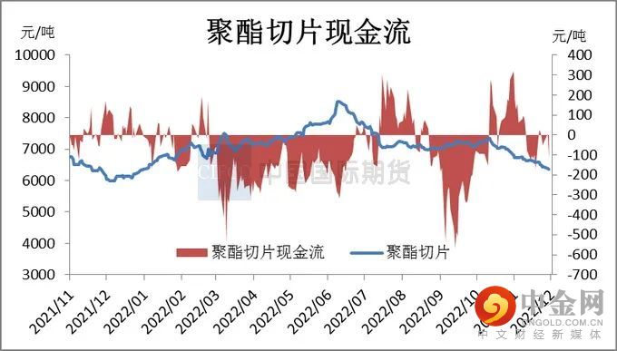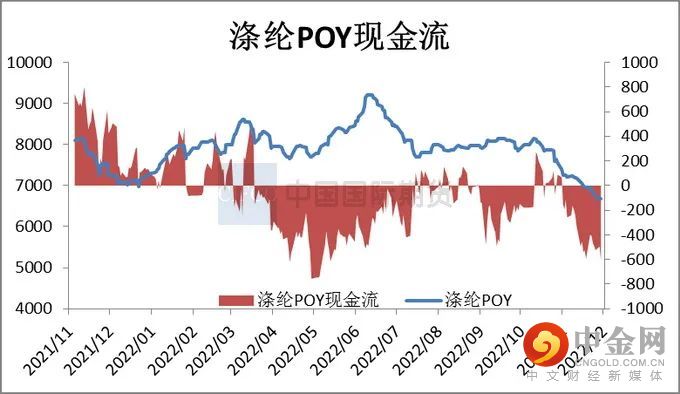 11月由于下游需求预期偏弱,陆续停车放假,中下旬涤丝价格低位震荡,亏损严重的情况下,下游采购依旧谨慎,涤丝工厂产销持续表现清淡。原计划的涤纶长丝投产新装置,以及前期顺延下来的新产能装置,有近170万吨直纺长丝新产能在11-12月份被确定搁置延后投产。11月涤丝现金流一度处于500-700元/吨的亏损幅度,甚至个别出货的低价现金流亏损达到800-900元/吨。