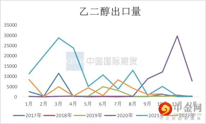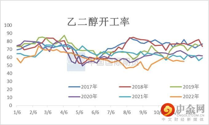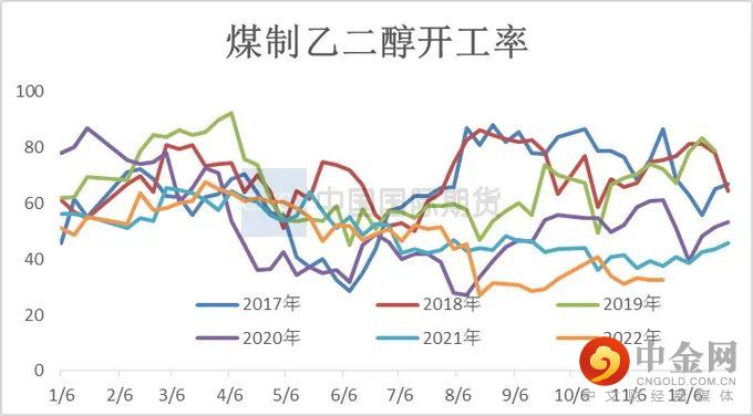 近五年来国内乙二醇产能保持较高增长速度,特别在2021年国内乙二醇产能增速为29.43%。11月乙二醇总产能为2399.5万吨,煤制乙二醇总产能为925万吨,新增陕西榆林化学60万吨装置。11月末新装置陕西榆林化学180万吨三条线全面开车,负荷提升至满开状态。11月煤制乙二醇开工率为32.55%,较10月下降4.48%,近期煤炭成本下降部分存量装置仍有适度提负可能。预计12月起煤制乙二醇负荷将回升至40%附近。