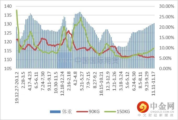 现代腊肉加工工艺分为原料选择、修整、配料、腌制、烘烤或熏制、包装,最后出来成品。在原料的选择上,制作腊肉应选择新鲜优质、符合卫生标准、无伤疤、皮薄肉嫩、肥膘在1.5cm以上、背膘厚度在4.0cm-5.0cm以上的新鲜猪肉为原料,也可选用冷冻肉。原料肉的肥瘦比例以5∶5或4∶6为宜。由于腌腊需要的猪肉需要有一定肥肉,瘦肉太多容易发柴,因此每当腌腊季节对于大肥猪的需求较高,通常以150公斤以上大猪为宜。复盘历年出栏均重,体重一般是从11月开始增长,主要是受到大猪压栏得影响。在非瘟之前正常时期的出栏均重在110公斤左右,到了腌腊季出栏均重能达到120多公斤,150公斤及以上大猪增长明显。及至非瘟之后,由于市场猪源的缺乏,以重补量,平时的出栏均重增至120公斤左右,到了腌腊季,出栏均重能达到130公斤以上,150公斤肥猪占比增加,有散户在腌腊季出栏的肥猪体重更大,有些能达到200公斤以上。