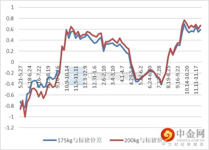 由于腌腊季对肥猪需求增加,那些在夏季被嫌弃的大肥猪则成了市场上的香饽饽,肥标价差出现反转。一般来说,一般时期对标猪偏好于肥猪,肥标价差为负,越是天热越不喜欢大猪;到了腌腊季大猪需求增加,肥标价差转正,该指标通常在行情开始前就出现,因为大猪压栏需要时间,而在压栏过程中市场大猪供应就会减少,因此肥猪价会相应增长。例如在2021年,由于经过前一年非瘟之后缺猪的影响,猪价高涨,养殖端选择压栏增重来补充市场上生猪量的缺少,当2021年春节后猪价开始持续下跌,养殖端开始压栏惜售赌行情好转,当猪价跌破20元每斤之后,大量二次育肥和压栏的入场,导致从5月开始生猪市场出现踩踏,猪价跌跌不休,而之后养殖端吸取教训一边去产能一边减重,到了10月出栏均重已经降至120公斤以下。但是由于去年天气冷的较往年早,大猪需求提前,叠加去产能和降重导致市场供应的生猪量出现缺口,因此去年腌腊季行情出现抢跑。从肥标价差可以看出,大猪的需求提前了,而且该指标提前于市场行情的反转。
