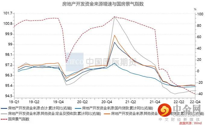 中金研究发现,在房地产资金来源中银行贷款和债券的占比较低,2021年期间二者合计仅占据14.6%,占据重要部分的一是定金预收款和个人按揭贷款,二是企业自筹资金,包括自有资金、股东投入资金和借入资金等。如果供给侧的“三支箭”(银行信贷支持、债券融资支持、股权融资松绑)落地效果很理想,但居民购房能力偏弱且对期房信心不足,也就是需求端改善不佳,商品房销售带来的该部分的资金回流速度可能较慢,那么房企的实际性好转可能还得再等。房地产市场能否回归景气仍然依赖于经济的改善,说到底,期债对房地产政策变动的剧烈反应也是对经济基本面的预期差反应,而另一方面则是地产融资放宽后对社融和宽信用推进的影响。