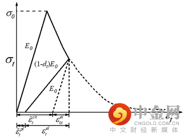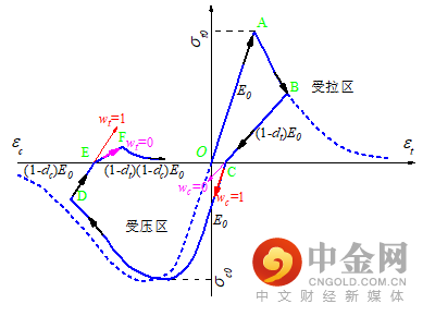 混凝土损伤塑性模型(Concretedamaged plasticitymodel,CDPM)如下图所示,从O点开始受拉逐渐加载到峰值A点,OA段为弹性阶段,弹性模量E0,继续加载,沿AB段进入软化阶段,B点卸载,卸载阶段考虑损伤,弹性模量为(1-dt)E0,然后进入反向加载,先进入弹性阶段,到达屈服点,进入软化阶段,到达D点卸载,DE段为考虑了损伤的卸载阶段,弹性模量要再考虑受压损伤的削减,为(1-dt)(1-dc)E0,其中wc和wt为1表示从开裂到压缩裂缝闭合,刚度完全恢复。