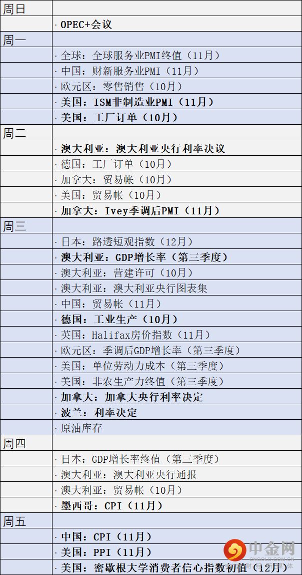 非农就业数据公布后的下一周经济日历通常清淡,本月也不例外。中国11月CPI预计与10月持平,同比增长2.1%。中国11月PPI预计-1.6%,前值-1.3%。本周的其他重要经济数据包括澳大利亚第三季度GDP、加拿大Ivey PMI,以及美国密歇根大学消费者信心指数初值。其余经济数据如下: